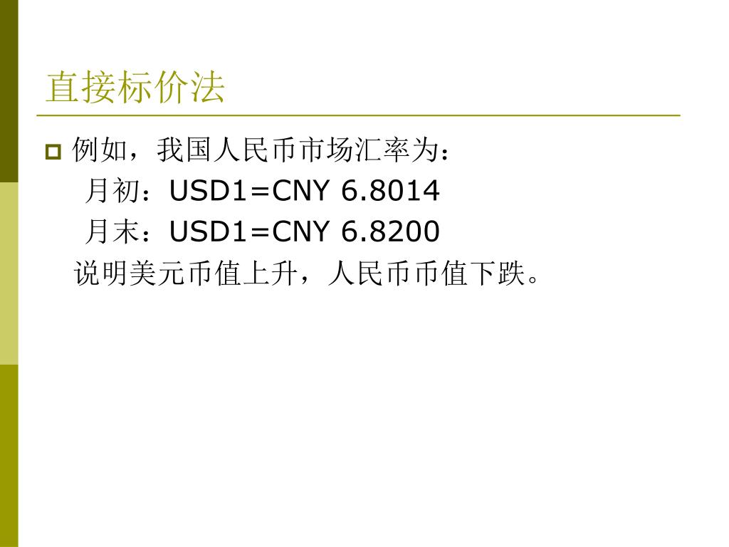 直接标价法 • 例如,我国人民币市场汇率为: 月初:USD1=CNY 6.8014 月末:USD1=CNY 6.8200 说明美元币值上升,人民币币值下跌。