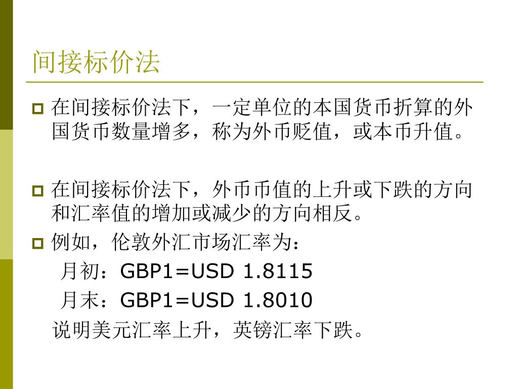 间接标价法 • 在间接标价法下,一定单位的本国货币折算的外国货币数量增多,称为外币贬值,或本币升值。 • 在间接标价法下,外币币值的上升或下跌的方向和汇率值的增加或减少的方向相反。 • 例如,伦敦外汇市场汇率为: 月初:GBP1=USD 1.8115 月末:GBP1=USD 1.8010 说明美元汇率上升,英镑汇率下跌。
