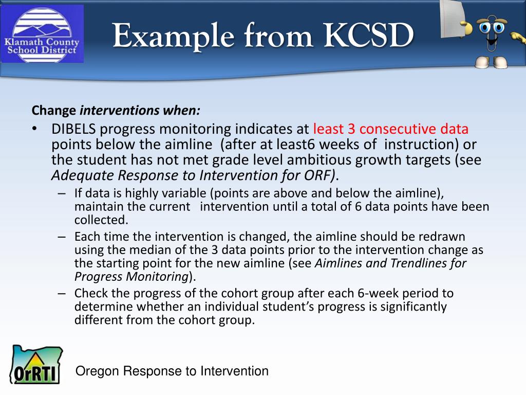 Example from KCSD Change interventions when: • DIBELS progress monitoring indicates at least 3 consecutive data points below the aimline (after at least6 weeks of instruction) or the student has not met grade level ambitious growth targets (see Adequate Response to Intervention for ORF). • If data is highly variable (points are above and below the aimline), maintain the current intervention until a total of 6 data points have been collected. • Each time the intervention is changed, the aimlineshould be redrawn using the median of the 3 data points prior to the intervention change as the starting point for the new aimline (see Aimlines and Trendlines for Progress Monitoring). • Check the progress of the cohort group after each 6-week period to determine whether an individual student’s progress is significantly different from the cohort group.
