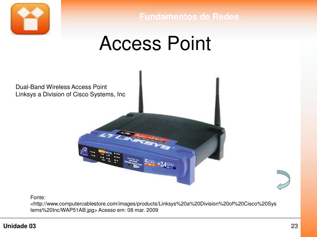 Access Point Dual-Band Wireless Access PointLinksys a Division of Cisco Systems, Inc Fonte: <http://www.computercablestore.com/images/products/Linksys%20a%20Division%20of%20Cisco%20Systems%20Inc/WAP51AB.jpg> Acesso em: 08 mar. 2009