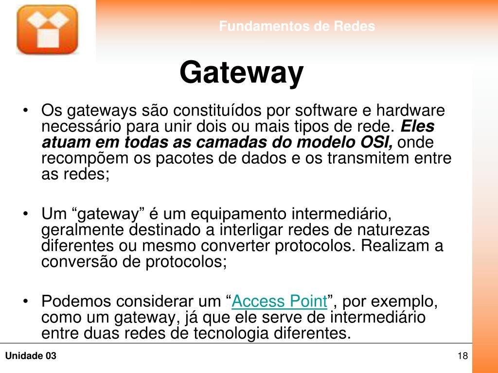 Os gateways são constituídos por software e hardware necessário para unir dois ou mais tipos de rede. Eles atuam em todas as camadas do modelo OSI, onde recompõem os pacotes de dados e os transmitem entre as redes; Um “gateway” é um equipamento intermediário, geralmente destinado a interligar redes de naturezas diferentes ou mesmo converter protocolos. Realizam a conversão de protocolos; Podemos considerar um “Access Point”, por exemplo, como um gateway, já que ele serve de intermediário entre duas redes de tecnologia diferentes. Gateway