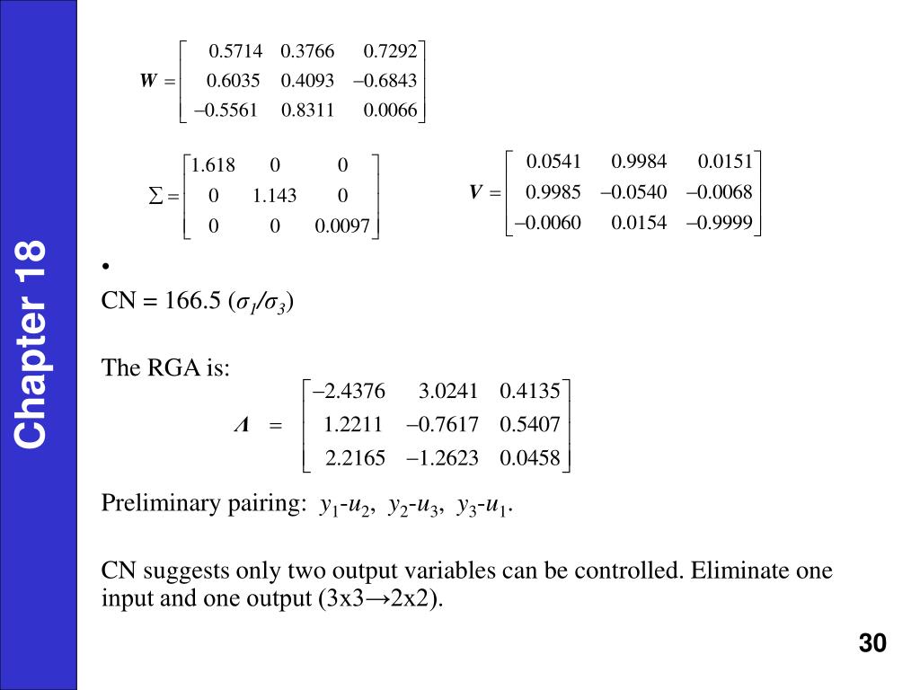 CN = 166.5 (σ1/σ3) The RGA is: Preliminary pairing: y1-u2, y2-u3, y3-u1. CN suggests only two output variables can be controlled. Eliminate one input and one output (3x3→2x2). Chapter 18 Chapter 18 30