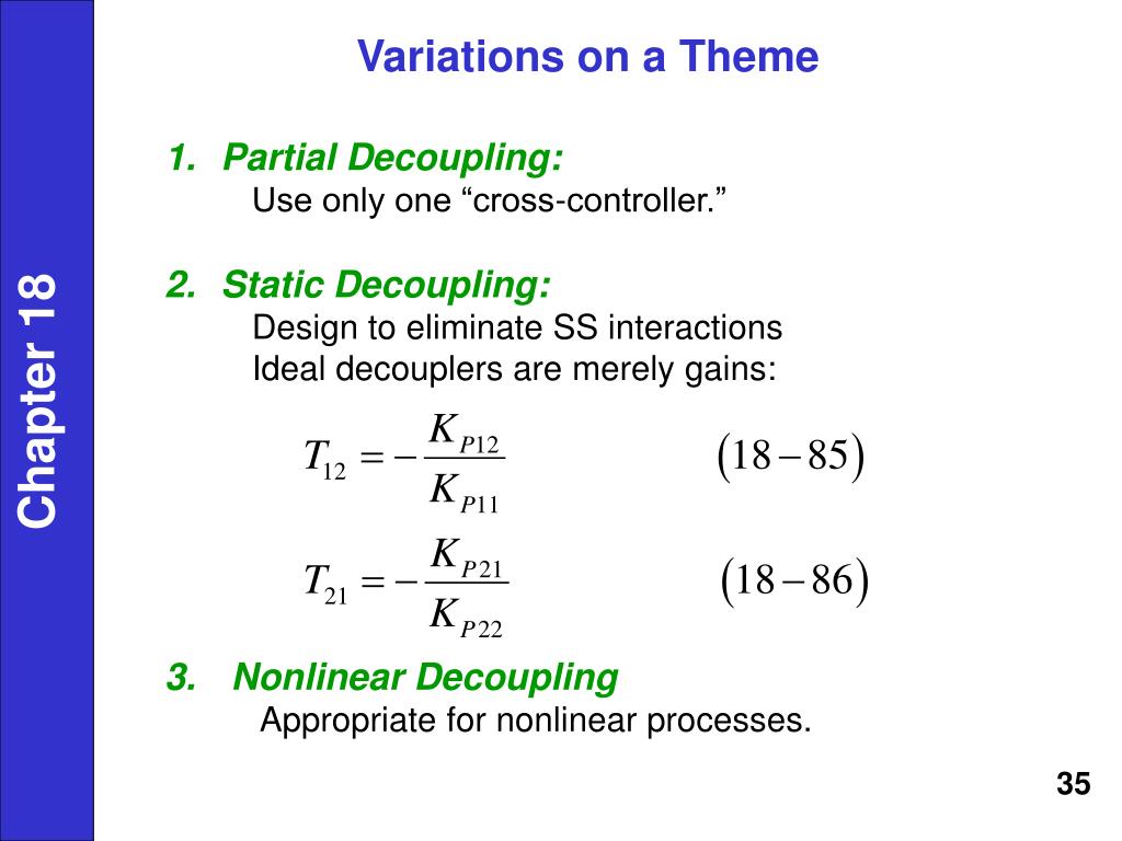 Decoupler Design Equations We want cross-controller, T12, to cancel the effect of U2 on Y1. Thus, we would like, Because U22 0 in general, then Chapter 18 Similarly, we want T12 to cancel the effect of U1 on Y2. Thus, we require that, Compare with the design equations for feedforward control based on block diagram analysis 34