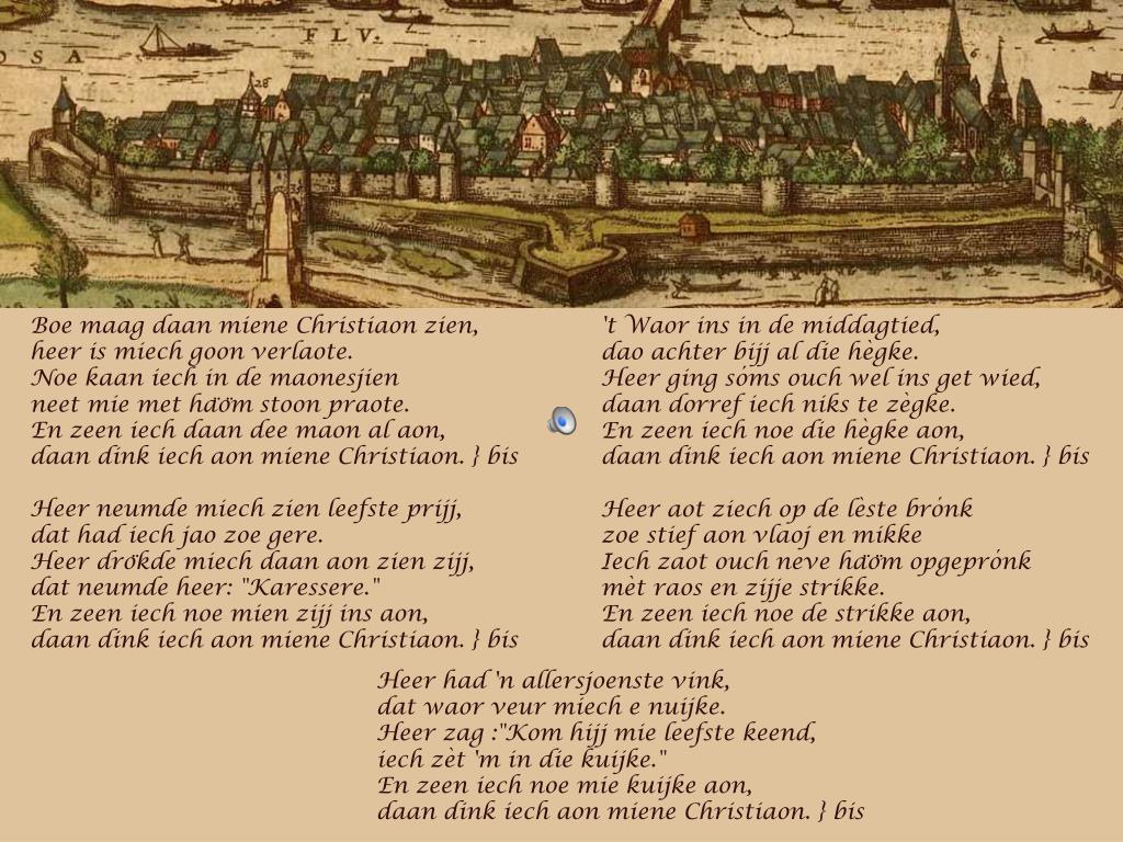 Boe maag daan miene Christiaon zien, heer is miech goon verlaote. Noe kaan iech in de maonesjien neet mie met häöm stoon praote. En zeen iech daan dee maon al aon, daan dink iech aon miene Christiaon. } bis Heer neumde miech zien leefste prijj, dat had iech jao zoe gere. Heer drökde miech daan aon zien zijj, dat neumde heer: "Karessere." En zeen iech noe mien zijj ins aon, daan dink iech aon miene Christiaon. } bis 't Waor ins in de middagtied, dao achter bijj al die hègke. Heer ging sóms ouch wel ins get wied, daan dorref iech niks te zègke. En zeen iech noe die hègke aon, daan dink iech aon miene Christiaon. } bis Heer aot ziech op de lèste brónk zoe stief aon vlaoj en mikke Iech zaot ouch neve häöm opgeprónk mèt raos en zijje strikke. En zeen iech noe de strikke aon, daan dink iech aon miene Christiaon. } bis Heer had 'n allersjoenste vink, dat waor veur miech e nuijke. Heer zag :"Kom hijj mie leefste keend, iech zèt 'm in die kuijke." En zeen iech noe mie kuijke aon, daan dink iech aon miene Christiaon. } bis