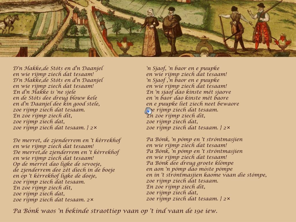 D'n Hakke,de Stóts en d'n Daanjel en wie rijmp ziech dat tesaam! D'n Hakke,de Stóts en d'n Daanjel en wie rijmp ziech dat tesaam! En d'n Hakke is 'ne sjele en de Stóts dee dreug blouw kele en d'n Daanjel dee kin good stele, zoe rijmp ziech dat tesaam. En zoe rijmp ziech dit, zoe rijmp ziech dat, zoe rijmp ziech dat tesaam. } 2× De merret, de zjenderrem en 't kèrrekhof en wie rijmp ziech dat tesaam! De merret,de zjenderrem en 't kèrrekhof en wie rijmp ziech dat tesaam! Op de merret dao ligke de sevoeje, de zjenderrem dee zèt diech in de boeje en op 't kèrrekhof ligke de doeje, zoe rijmp ziech dat tesaam. En zoe rijmp ziech dit, zoe rijmp ziech dat, zoe rijmp ziech dat tesaam. 2× 'n Sjaof, 'n baor en e puupke en wie rijmp ziech dat tesaam! 'n Sjaof ,'n baor en e puupke en wie rijmp ziech dat tesaam! En 'n sjaof dao kinste mèt sjaove en 'n baor dao kinste mèt baore en e puupke liet ziech neet bewaore zoe rijmp ziech dat tesaam. En zoe rijmp ziech dit, zoe rijmp ziech dat, zoe rijmp ziech dat tesaam. } 2× Pa Bónk, 'n pómp en 't stróntmasjien en wie rijmp ziech dat tesaam! Pa Bónk, 'n pómp en 't stróntmasjien en wie rijmp ziech dat tesaam! Pa Bónk dee dreug groete klómpe en aon 'n pómp dao móste pómpe en in 't stróntmasjien kaome vaan die stómpe, zoe rijmp ziech dat tesaam. En zoe rijmp ziech dit, zoe rijmp ziech dat, zoe rijmp ziech dat tesaam. } 2× Pa Bónk waos 'n bekinde straottiep vaan op 't ind vaan de 19e iew.