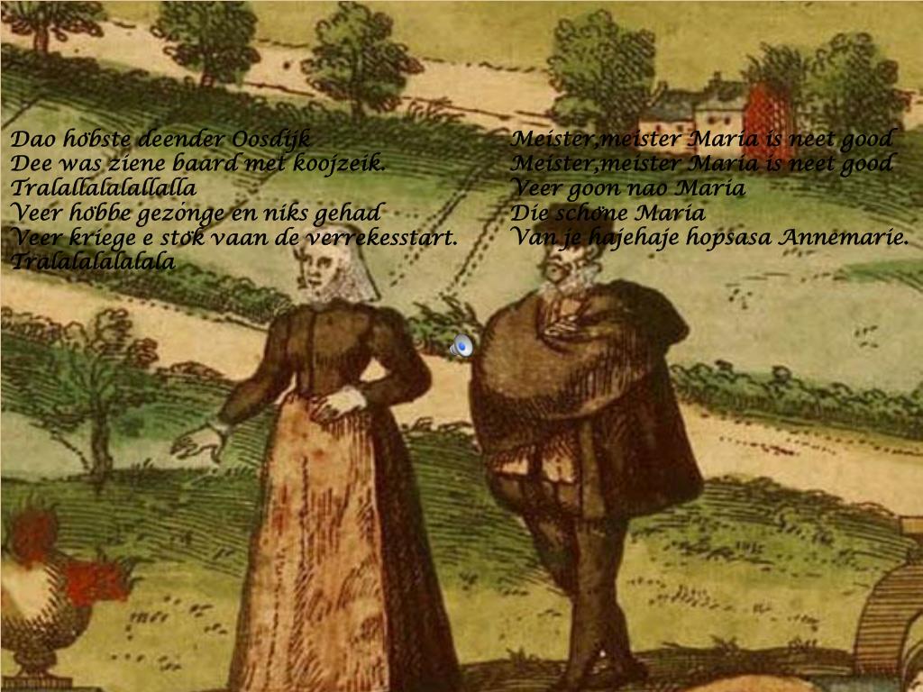 Dao höbste deender Oosdijk Dee was ziene baard met koojzeik. Tralallalalallalla Veer höbbe gezónge en niks gehad Veer kriege e stök vaan de verrekesstart. Tralalalalalala Meister,meister Maria is neet good Meister,meister Maria is neet good Veer goon nao Maria Die schöne Maria Van je hajehaje hopsasa Annemarie.