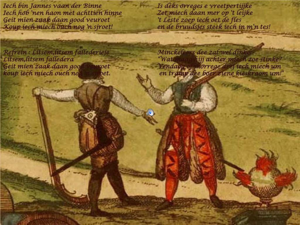 Iech bin Jannes vaan der Binne Iech höb 'nen haon mèt achttien hinne Geit mien zaak daan good veuroet Koup iech miech ouch nog 'n sjroet! Is dèks örreges e vreetpertijjke Zet miech daan mer op 't leijke 't Lèste zoep iech oet de fles en de bruudsjes steek iech in m'n tes! Refrein : Litsem,litsem fallederieje Litsem,litsem falledera Geit mien zaak daan good veuroet koup iech miech ouch nog 'n sjroet. Minckeleers dee zal wel dinke: "Wat maag hijj achter miech zoe stinke? Vendaog of mörrege drej iech miech um en tramp dee boer ziene kieskraom um!"