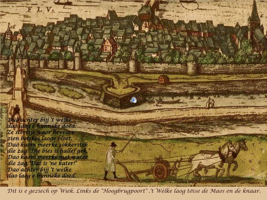 Dao achter bijj 't wèlke dao laog e hunneke doed. Ze stertsje waor bevrore zien betskes laoge bloet. Dao kaom meerke sókkerstek die zag:"Die bies is hallef gek." Dao kaom meerke met water die zag:"Dat is 'ne kater!" Dao achter bijj 't wèlke dao laog e hunneke doed. Dit is e geziech op Wiek. Links de "Hoogbrugpoort" .'t Wèlke laog tösse de Maos en de knaar.