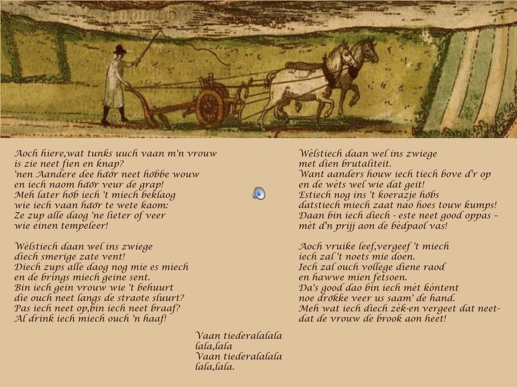 Aoch hiere,wat tunks uuch vaan m'n vrouw is zie neet fien en knap? 'nen Aandere dee häör neet höbbe wouw en iech naom häör veur de grap! Meh later höb iech 't miech beklaog wie iech vaan häör te wete kaom: Ze zup alle daog 'ne lieter of veer wie einen tempeleer! Wèlstiech daan wel ins zwiege diech smerige zate vent! Diech zups alle daog nog mie es miech en de brings miech geine sent. Bin iech gein vrouw wie 't behuurt die ouch neet langs de straote sluurt? Pas iech neet op,bin iech neet braaf? Al drink iech miech ouch 'n haaf! Wèlstiech daan wel ins zwiege met dien brutaliteit. Want aanders houw iech tiech bove d'r op en de wèts wel wie dat geit! Estiech nog ins 't koerazje höbs datstiech miech zaat nao hoes touw kumps! Daan bin iech diech - este neet good oppas – mèt d'n prijj aon de bèdpaol vas! Aoch vruike leef,vergeef 't miech iech zal 't noets mie doen. Iech zal ouch vollege diene raod en hawwe mien fetsoen. Da's good dao bin iech mèt kóntent noe drökke veer us saam' de hand. Meh wat iech diech zèk-en vergeet dat neet- dat de vrouw de brook aon heet! Vaan tiederalalala lala,lala Vaan tiederalalala lala,lala.