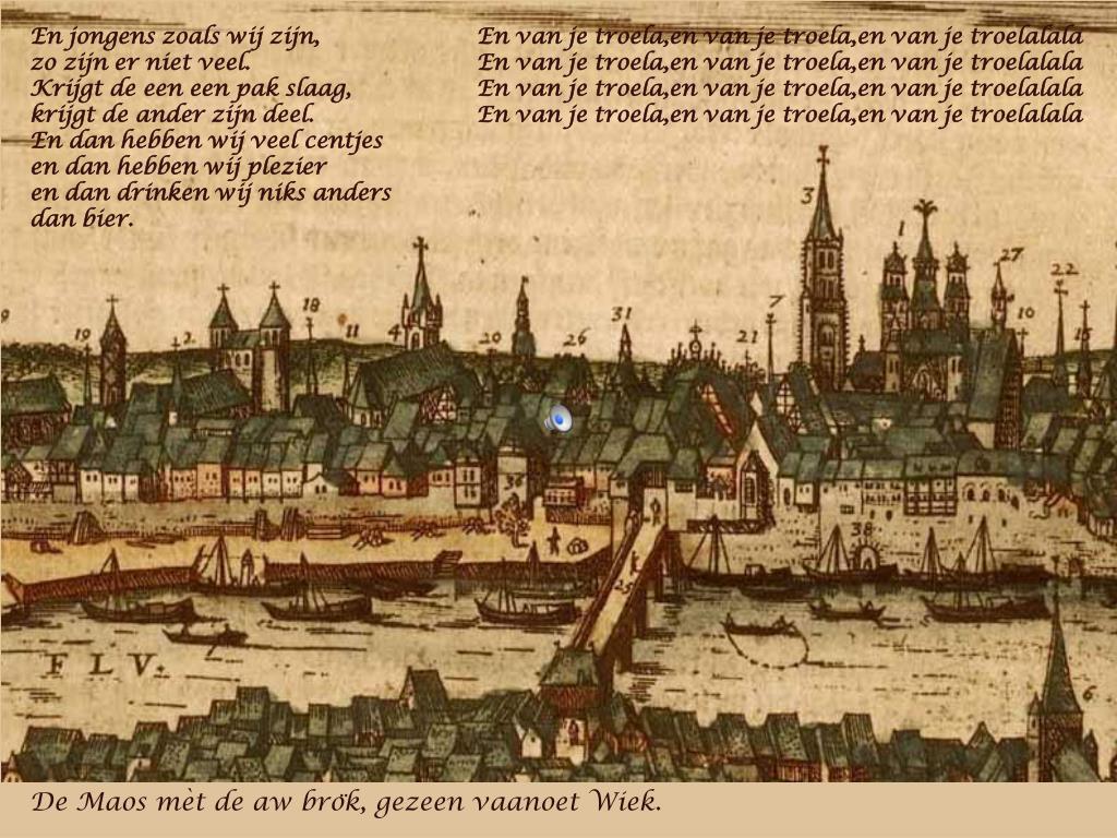 En jongens zoals wij zijn, zo zijn er niet veel. Krijgt de een een pak slaag, krijgt de ander zijn deel. En dan hebben wij veel centjes en dan hebben wij plezier en dan drinken wij niks anders dan bier. En van je troela,en van je troela,en van je troelalala En van je troela,en van je troela,en van je troelalala En van je troela,en van je troela,en van je troelalala En van je troela,en van je troela,en van je troelalala De Maos mèt de aw brök, gezeen vaanoet Wiek.