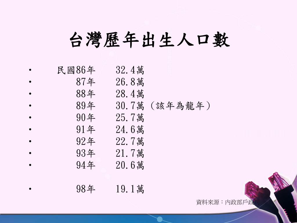 台灣歷年出生人口數 • 民國86年 32.4萬 • 87年 26.8萬 • 88年 28.4萬 • 89年 30.7萬 (該年為龍年) • 90年 25.7萬 • 91年 24.6萬 • 92年 22.7萬 • 93年 21.7萬 • 94年 20.6萬 • 98年 19.1萬 資料來源:內政部戶政司