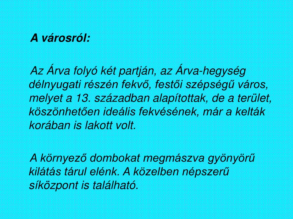 A városról: Az Árva folyó két partján, az Árva-hegység délnyugati részén fekvő, festői szépségű város, melyet a 13. században alapítottak, de a terület, köszönhetően ideális fekvésének, már a kelták korában is lakott volt. A környező dombokat megmászva gyönyörű kilátás tárul elénk. A közelben népszerű síközpont is található.