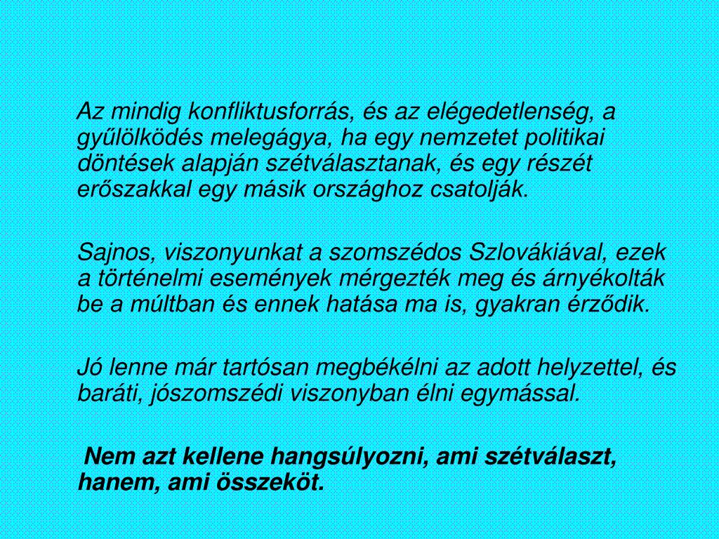 Az mindig konfliktusforrás, és az elégedetlenség, a gyűlölködés melegágya, ha egy nemzetet politikai döntések alapján szétválasztanak, és egy részét erőszakkal egy másik országhoz csatolják. Sajnos, viszonyunkat a szomszédos Szlovákiával, ezek a történelmi események mérgezték meg és árnyékolták be a múltban és ennek hatása ma is, gyakran érződik. Jó lenne már tartósan megbékélni az adott helyzettel, és baráti, jószomszédi viszonyban élni egymással. Nem azt kellene hangsúlyozni, ami szétválaszt, hanem, ami összeköt.