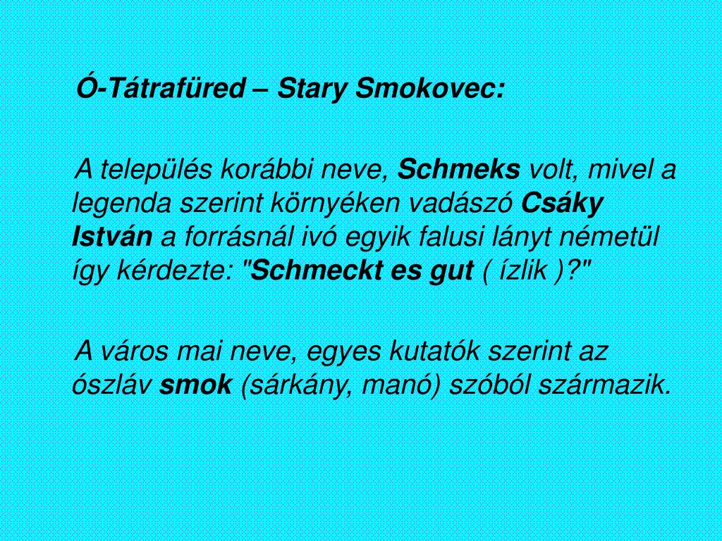 Ó-Tátrafüred – Stary Smokovec: A település korábbi neve, Schmeks volt, mivel a legenda szerint környéken vadászó Csáky István a forrásnál ivó egyik falusi lányt németül így kérdezte: "Schmeckt es gut ( ízlik )?" A város mai neve, egyes kutatók szerint az ószláv smok (sárkány, manó) szóból származik.