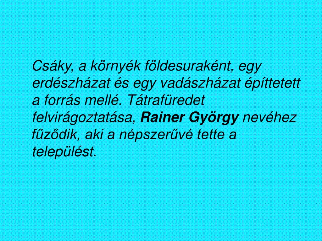 Csáky, a környék földesuraként, egy erdészházat és egy vadászházat építtetett a forrás mellé. Tátrafüredet felvirágoztatása, Rainer György nevéhez fűződik, aki a népszerűvé tette a települést.