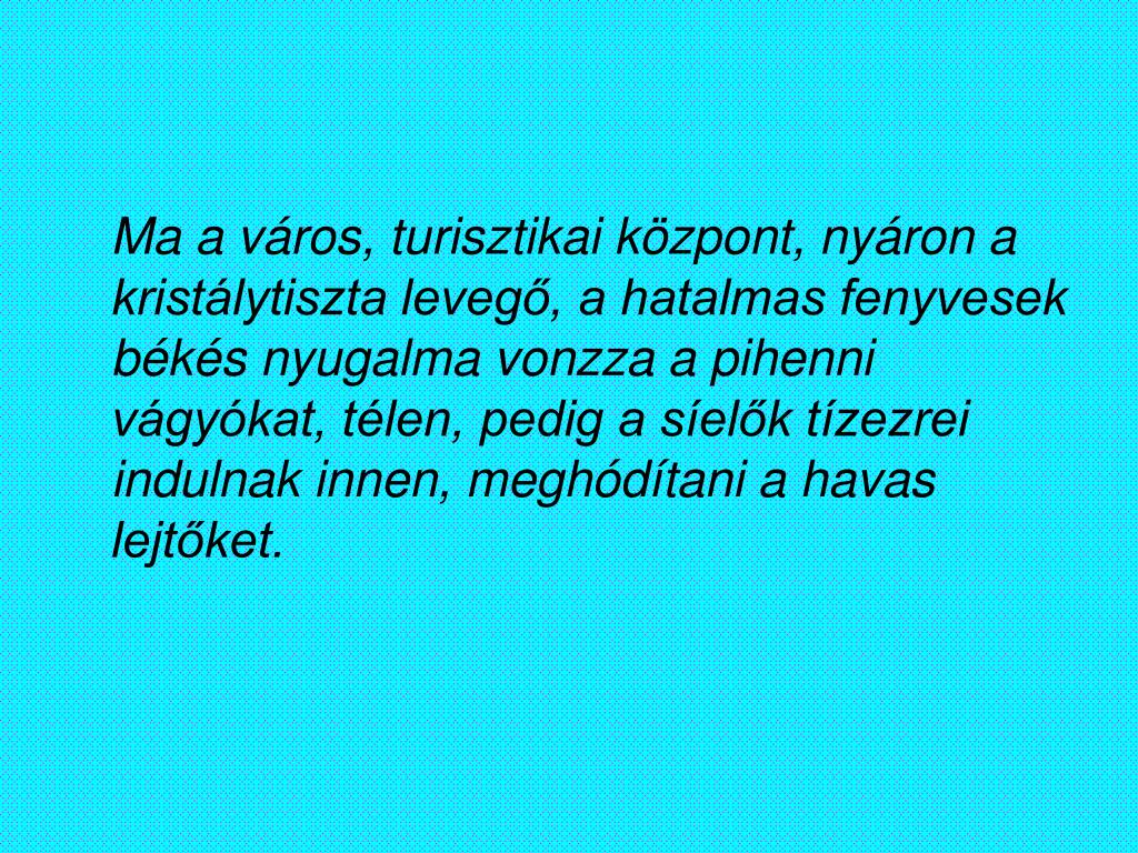 Ma a város, turisztikai központ, nyáron a kristálytiszta levegő, a hatalmas fenyvesek békés nyugalma vonzza a pihenni vágyókat, télen, pedig a síelők tízezrei indulnak innen, meghódítani a havas lejtőket.
