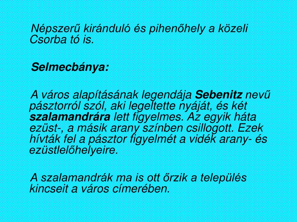 Népszerű kiránduló és pihenőhely a közeli Csorba tó is. Selmecbánya: A város alapításának legendája Sebenitz nevű pásztorról szól, aki legeltette nyáját, és két szalamandrára lett figyelmes. Az egyik háta ezüst-, a másik arany színben csillogott. Ezek hívták fel a pásztor figyelmét a vidék arany- és ezüstlelőhelyeire. A szalamandrák ma is ott őrzik a település kincseit a város címerében.
