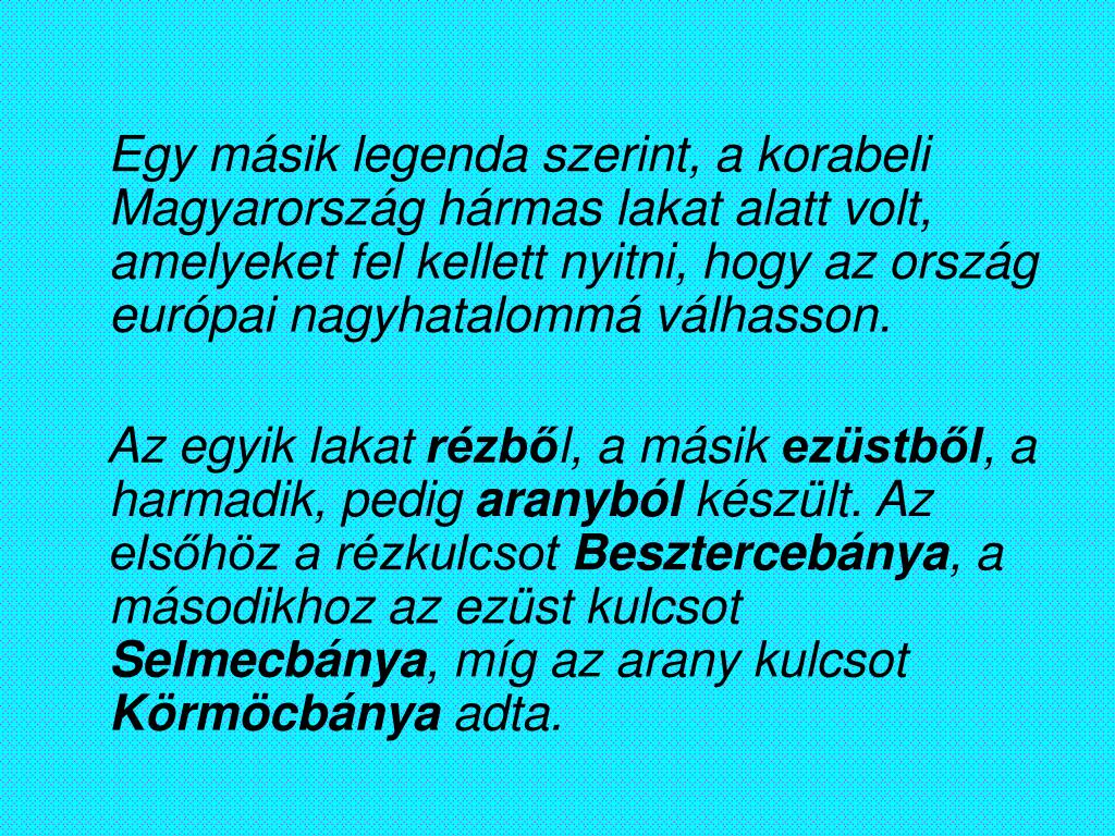 Egy másik legenda szerint, a korabeli Magyarország hármas lakat alatt volt, amelyeket fel kellett nyitni, hogy az ország európai nagyhatalommá válhasson. Az egyik lakat rézből, a másik ezüstből, a harmadik, pedig aranyból készült. Az elsőhöz a rézkulcsot Besztercebánya, a másodikhoz az ezüst kulcsot Selmecbánya, míg az arany kulcsot Körmöcbánya adta.