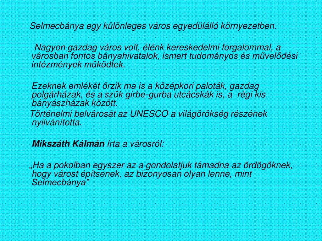 Selmecbánya egy különleges város egyedülálló környezetben. Nagyon gazdag város volt, élénk kereskedelmi forgalommal, a városban fontos bányahivatalok, ismert tudományos és művelődési intézmények működtek. Ezeknek emlékét őrzik ma is a középkori paloták, gazdag polgárházak, és a szűk girbe-gurba utcácskák is, a régi kis bányászházak között. Történelmi belvárosát az UNESCO a világörökség részének nyilvánította. Mikszáth Kálmán írta a városról: „Ha a pokolban egyszer az a gondolatjuk támadna az ördögöknek, hogy várost építsenek, az bizonyosan olyan lenne, mint Selmecbánya”
