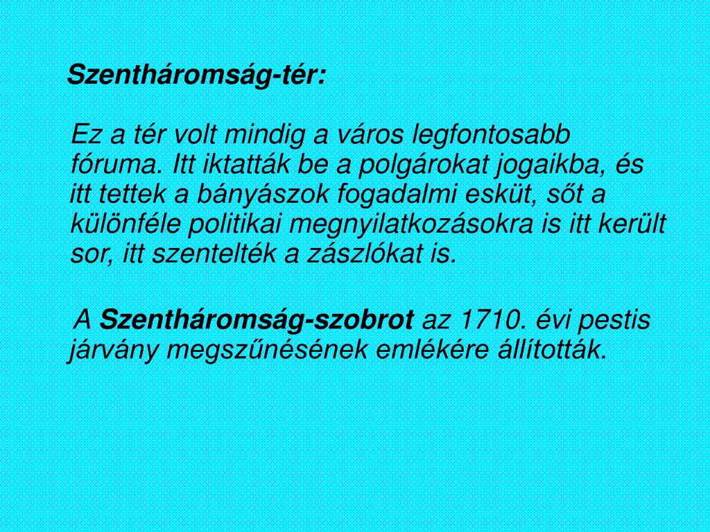 Szentháromság-tér:Ez a tér volt mindig a város legfontosabb fóruma. Itt iktatták be a polgárokat jogaikba, és itt tettek a bányászok fogadalmi esküt, sőt a különféle politikai megnyilatkozásokra is itt került sor, itt szentelték a zászlókat is. A Szentháromság-szobrot az 1710. évi pestis járvány megszűnésének emlékére állították.
