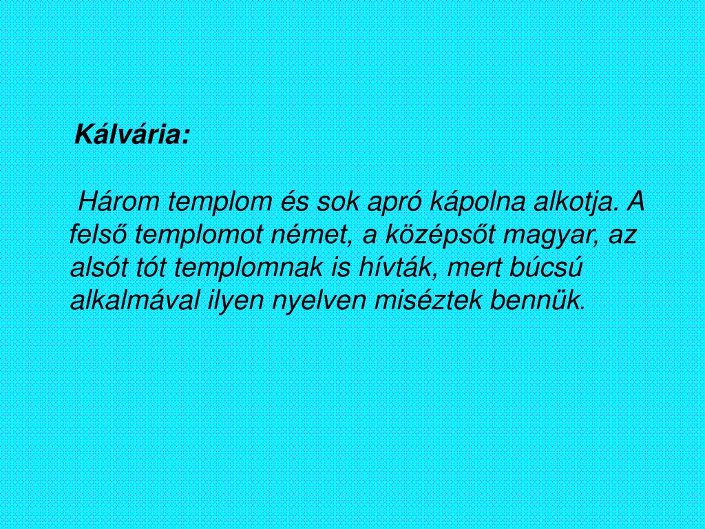 Kálvária: Három templom és sok apró kápolna alkotja. A felső templomot német, a középsőt magyar, az alsót tót templomnak is hívták, mert búcsú alkalmával ilyen nyelven miséztek bennük.