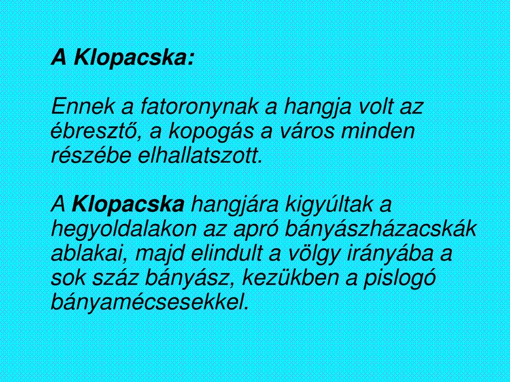 AKlopacska:Ennek a fatoronynak a hangja volt az ébresztő, a kopogás a város minden részébe elhallatszott. A Klopacska hangjára kigyúltak a hegyoldalakon az apró bányászházacskák ablakai, majd elindult a völgy irányába a sok száz bányász, kezükben a pislogó bányamécsesekkel.