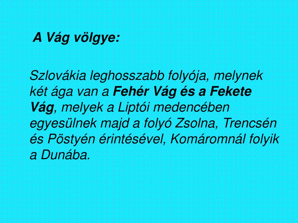 A Vág völgye: Szlovákia leghosszabb folyója, melynek két ága van a Fehér Vág és a Fekete Vág, melyek a Liptói medencében egyesülnek majd a folyó Zsolna, Trencsén és Pöstyén érintésével, Komáromnál folyik a Dunába.
