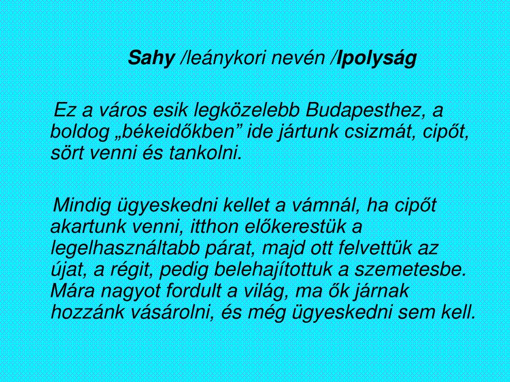 Sahy /leánykori nevén /Ipolyság Ez a város esik legközelebb Budapesthez, a boldog „békeidőkben” ide jártunk csizmát, cipőt, sört venni és tankolni. Mindig ügyeskedni kellet a vámnál, ha cipőt akartunk venni, itthon előkerestük a legelhasználtabb párat, majd ott felvettük az újat, a régit, pedig belehajítottuk a szemetesbe. Mára nagyot fordult a világ, ma ők járnak hozzánk vásárolni, és még ügyeskedni sem kell.