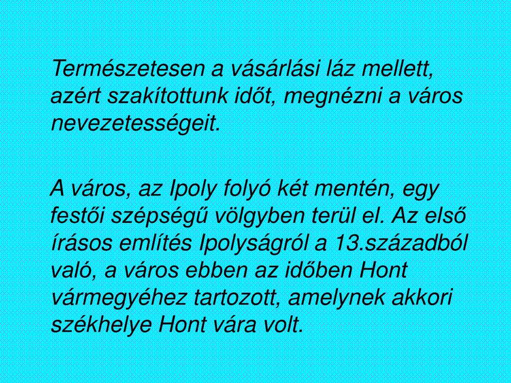 Természetesen a vásárlási láz mellett, azért szakítottunk időt, megnézni a város nevezetességeit. A város, az Ipoly folyó két mentén, egy festői szépségű völgyben terül el.Az első írásos említés Ipolyságról a 13.századból való, a város ebben az időben Hont vármegyéhez tartozott, amelynek akkori székhelye Hont vára volt.