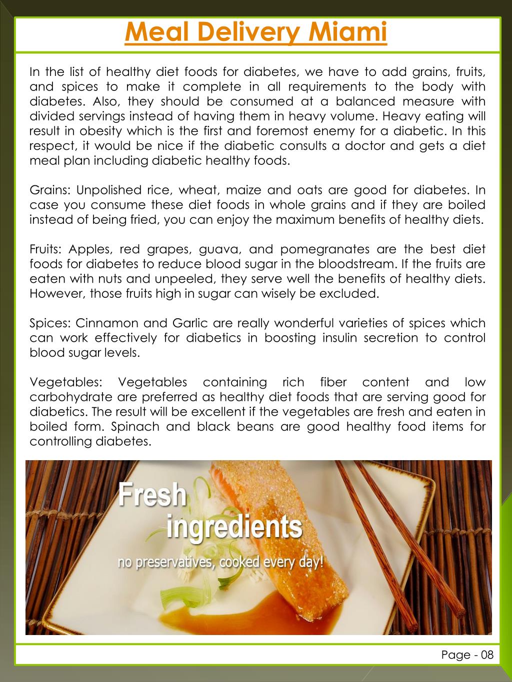 Meal Delivery Miami In the list of healthy diet foods for diabetes, we have to add grains, fruits, and spices to make it complete in all requirements to the body with diabetes. Also, they should be consumed at a balanced measure with divided servings instead of having them in heavy volume. Heavy eating will result in obesity which is the first and foremost enemy for a diabetic. In this respect, it would be nice if the diabetic consults a doctor and gets a diet meal plan including diabetic healthy foods. Grains: Unpolished rice, wheat, maize and oats are good for diabetes. In case you consume these diet foods in whole grains and if they are boiled instead of being fried, you can enjoy the maximum benefits of healthy diets. Fruits: Apples, red grapes, guava, and pomegranates are the best diet foods for diabetes to reduce blood sugar in the bloodstream. If the fruits are eaten with nuts and unpeeled, they serve well the benefits of healthy diets. However, those fruits high in sugar can wisely be excluded. Spices: Cinnamon and Garlic are really wonderful varieties of spices which can work effectively for diabetics in boosting insulin secretion to control blood sugar levels. Vegetables: Vegetables containing rich fiber content and low carbohydrate are preferred as healthy diet foods that are serving good for diabetics. The result will be excellent if the vegetables are fresh and eaten in boiled form. Spinach and black beans are good healthy food items for controlling diabetes. Page - 08