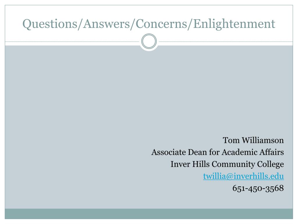 Questions/Answers/Concerns/Enlightenment Tom Williamson Associate Dean for Academic Affairs Inver Hills Community College twillia@inverhills.edu 651-450-3568