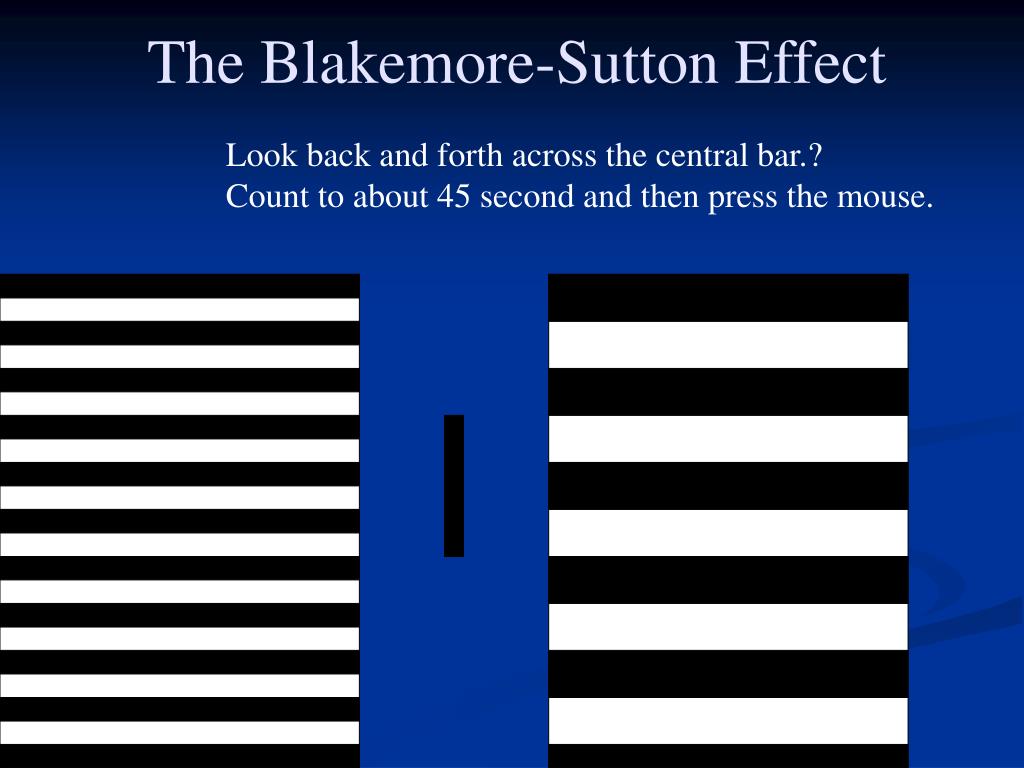 Look back and forth across the central bar.? Count to about 45 second and then press the mouse. The Blakemore-Sutton Effect