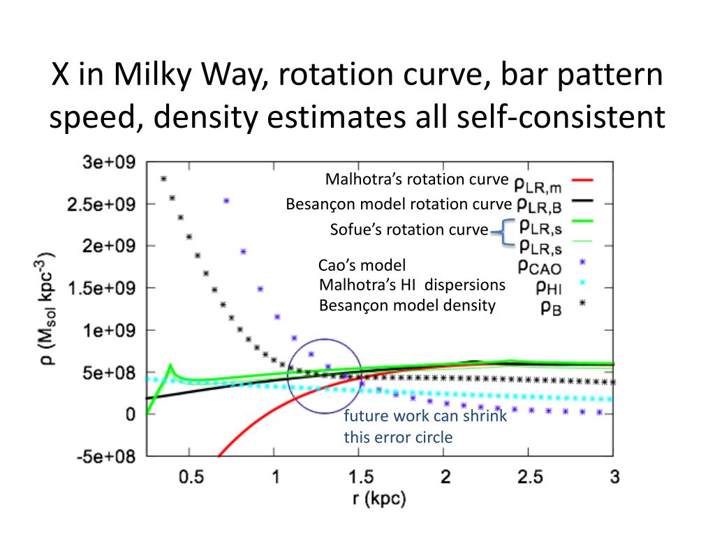 X in Milky Way, rotation curve, bar pattern speed, densityestimates all self-consistent Malhotra’s rotation curve Besançon model rotation curve Sofue’s rotation curve Cao’s model Malhotra’s HI dispersions Besançon model density future work can shrink this error circle