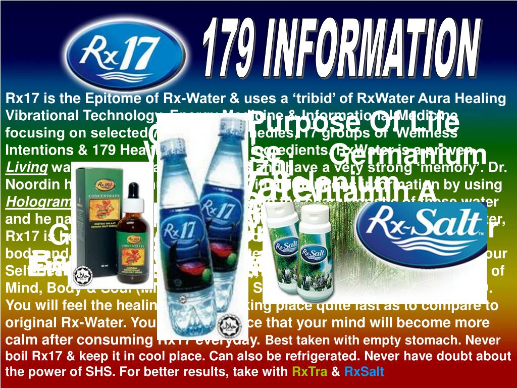 179 INFORMATION Rx17 is the Epitome of Rx-Water & uses a ‘tribid’ of RxWater Aura Healing Vibrational Technology, Energy Medicine & Informational Medicine focusing on selected 7 Physical Remedies, 17 groups of ‘Wellness Intentions & 179 Health information ingredients. RxWater is a proven Living water with therapeutic values and have a very strong ‘memory’. Dr. Noordin has put 179 nutrients & Spiritual intentions information by using Hologram technology without changing the characteristic of these water and he named it Rx17. If we test the weight of Rx17 with normal RxWater, Rx17 is heavier because of these information. It will be transfer to our body and blends with it to heals faster. It will remarkably rejuvenates your Self-Healing System functions (SHS), which is the highest & best form of Mind, Body & Soul (MiFiRo) Healing System which is the gift from GOD. You will feel the healing process taking place quite fast as to compare to original Rx-Water. You will also notice that your mind will become more calm after consuming Rx17 everyday. Best taken with empty stomach. Never boil Rx17 & keep it in cool place. Can also be refrigerated. Never have doubt about the power of SHS. For better results, take with RxTra & RxSalt Purpose Of Life Grateful Wild Rose Germanium Lingzhi 1. Rx-Water Selenium Vitamin A 179. Love Peace Of Mind Spirulina Olives Dates Green Colour Orange Colour Geranium Honey Green Tea Ginseng Amethyst Purple Colour Bamboo Salts Rosehip Bird’s Nest Anti-Toxins Energy & Health Vitamins B1-12 Red Beet