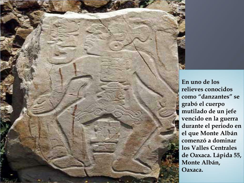 En uno de los relieves conocidos como “danzantes” se grabó el cuerpo mutilado de un jefe vencido en la guerra durante el periodo en el que Monte Albán comenzó a dominar los Valles Centrales de Oaxaca. Lápida 55, Monte Albán, Oaxaca.