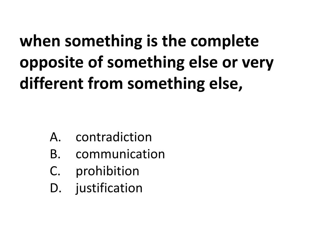 when something is the complete opposite of something else or very different from something else, • contradiction • communication • prohibition • justification