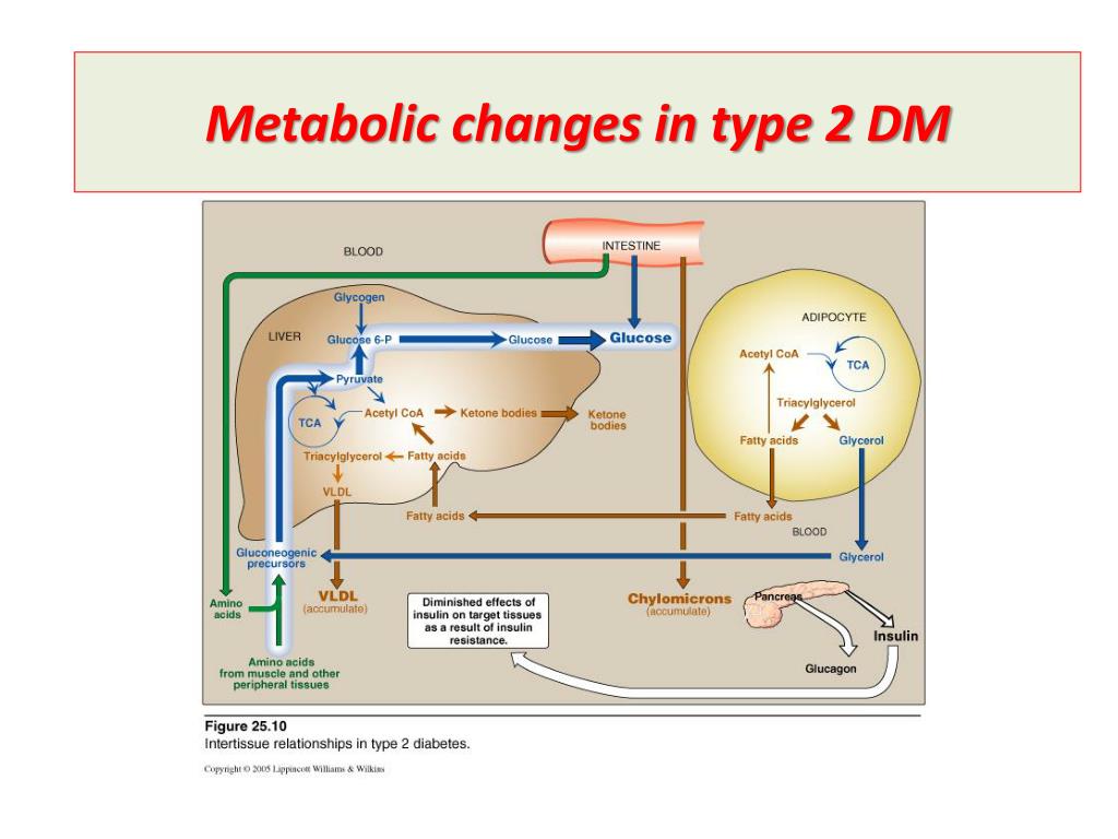 Metabolic changes in type 2 DM metabolic abnormalities of type 2 DM are the results of insulin resistance (in liver, muscle & adipose tissue) 1- hyperglycemia (BUT: diabetic ketoacidosis is minimal or absent) 2- hypertriacylglyceridemia