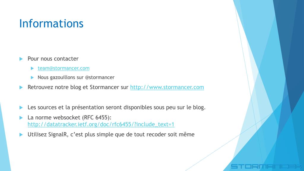 Informations • Pour nous contacter • team@stormancer.com • Nous gazouillons sur @stormancer • Retrouvez notre blog et Stormancer sur http://www.stormancer.com • Les sources et la présentation seront disponibles sous peu sur le blog. • La norme websocket (RFC 6455): http://datatracker.ietf.org/doc/rfc6455/?include_text=1 • Utilisez SignalR, c’est plus simple que de tout recoder soit même