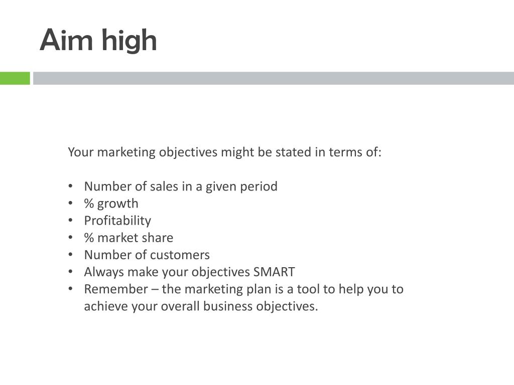 Aim high • Your marketing objectives might be stated in terms of: • Number of sales in a given period • % growth • Profitability • % market share • Number of customers • Always make your objectives SMART • Remember – the marketing plan is a tool to help you to achieve your overall business objectives.