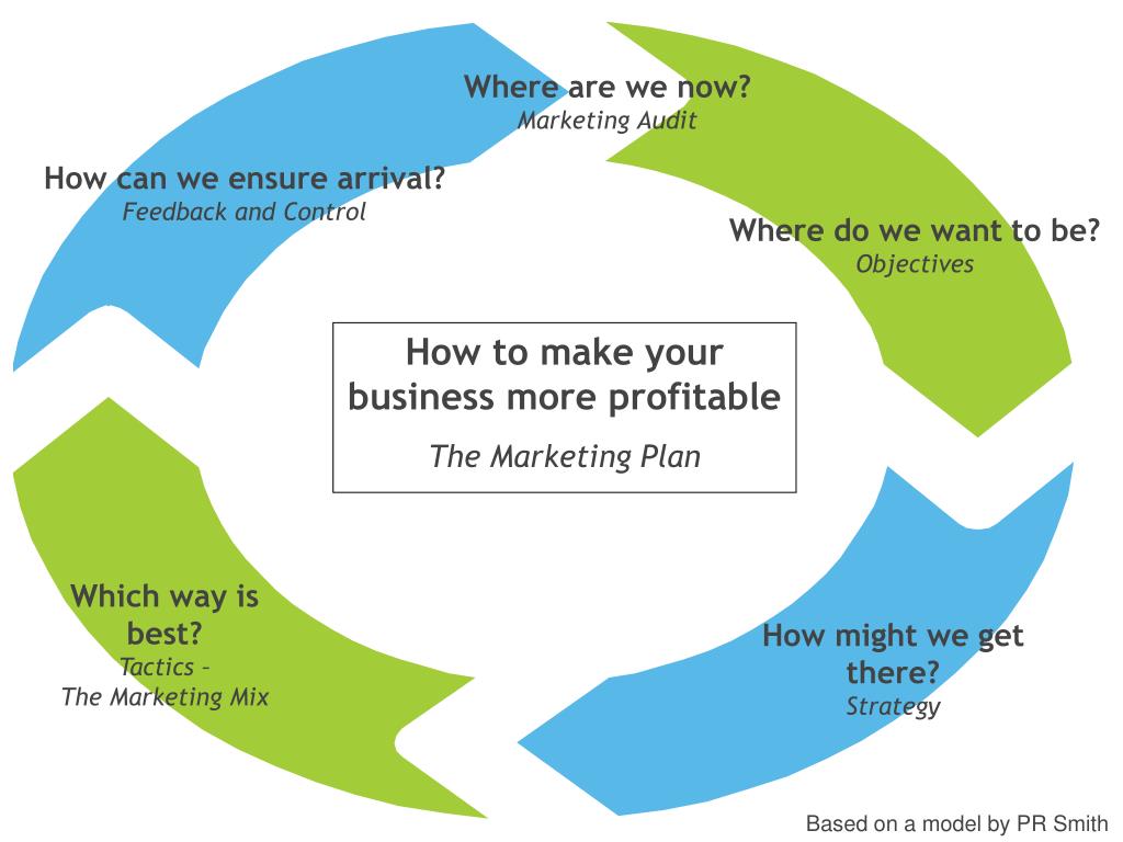 Where are we now? Marketing Audit How can we ensure arrival? Feedback and Control Where do we want to be? Objectives How to make your business more profitable The Marketing Plan Which way is best? Tactics – The Marketing Mix How might we get there? Strategy Based on a model by PR Smith