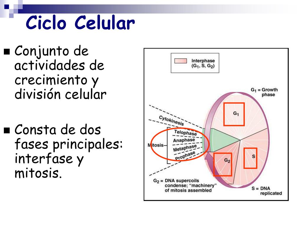 Ciclo Celular • Conjunto de actividades de crecimiento y división celular • Consta de dos fases principales: interfase y mitosis.