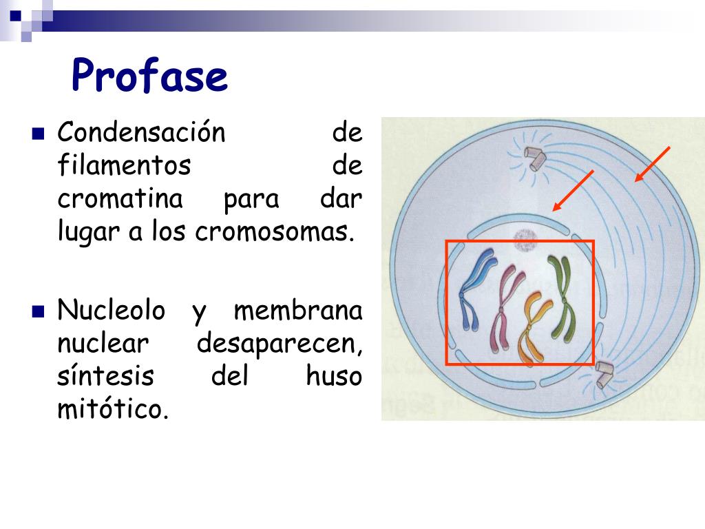 Profase • Condensación de filamentos de cromatina para dar lugar a los cromosomas. • Nucleolo y membrana nuclear desaparecen, síntesis del huso mitótico.