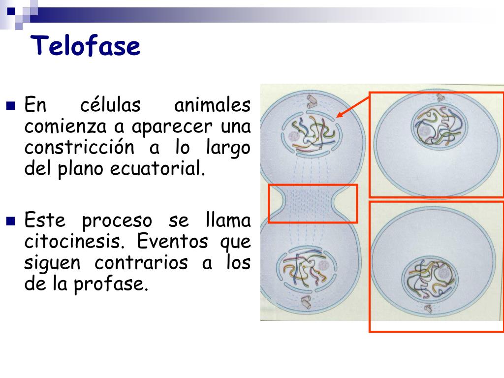 Telofase • En células animales comienza a aparecer una constricción a lo largo del plano ecuatorial. • Este proceso se llama citocinesis. Eventos que siguen contrarios a los de la profase.