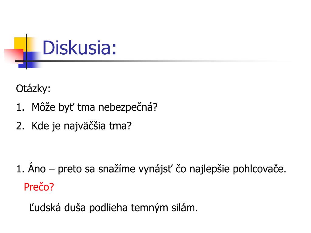 Diskusia: • Otázky: • Môže byť tma nebezpečná? • Kde je najväčšia tma? 1. Áno – preto sa snažíme vynájsť čo najlepšie pohlcovače. Prečo? Ľudská duša podlieha temným silám.