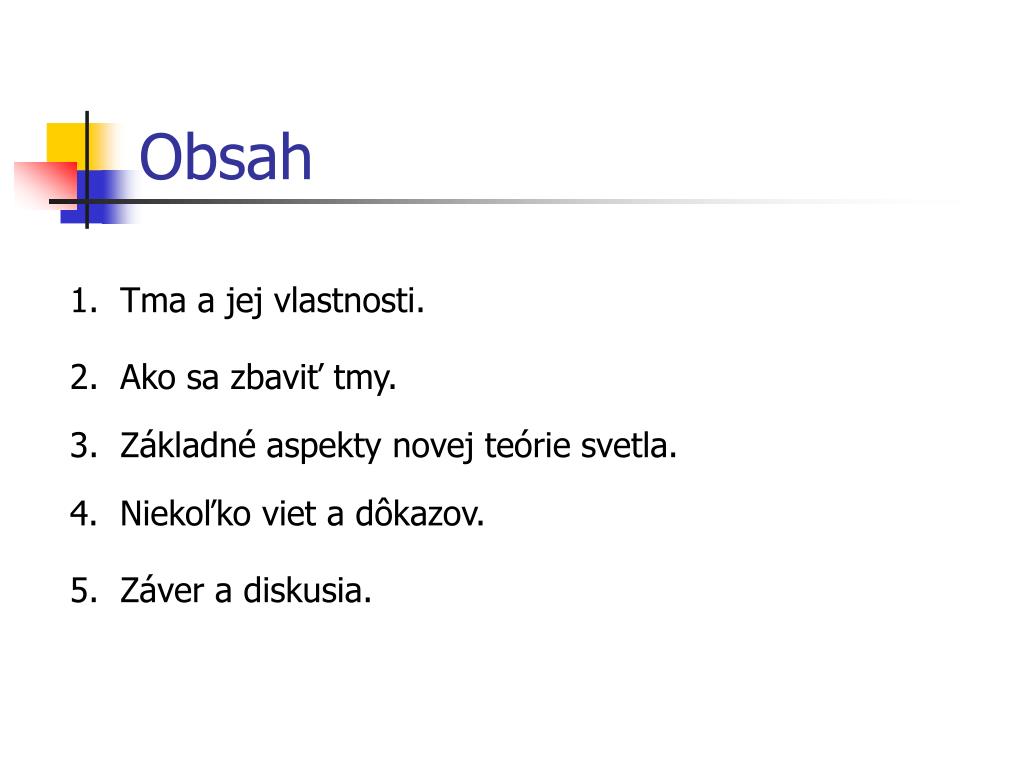 Obsah 1. Tma a jej vlastnosti. 2. Ako sa zbaviť tmy. 3. Základné aspekty novej teórie svetla. 4. Niekoľko viet a dôkazov. 5. Záver a diskusia.