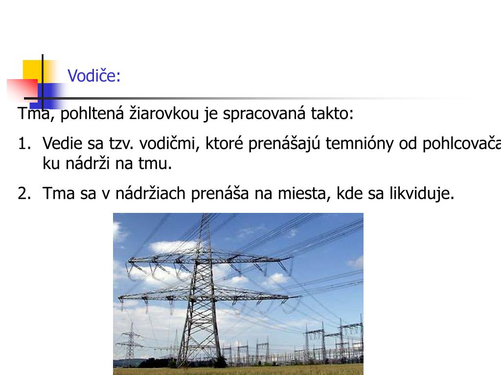 Vodiče: • Tma, pohltená žiarovkou je spracovaná takto: • Vedie sa tzv. vodičmi, ktoré prenášajú temnióny od pohlcovača ku nádrži na tmu. • Tma sa v nádržiach prenáša na miesta, kde sa likviduje.