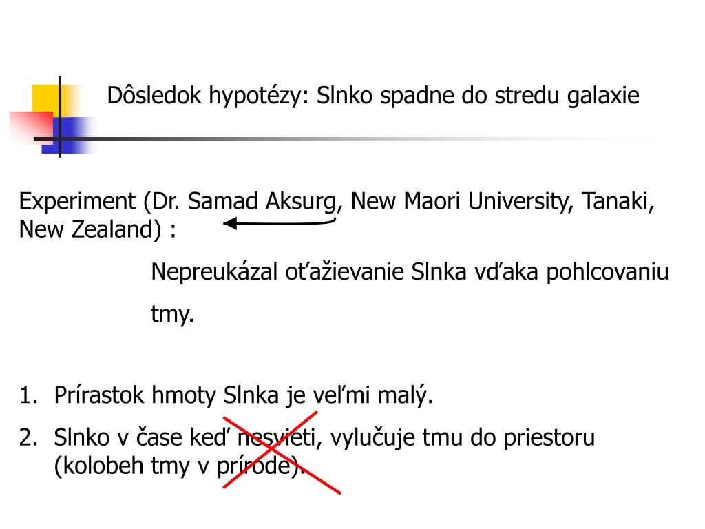 Experiment (Dr. Samad Aksurg, New Maori University, Tanaki, New Zealand) : Nepreukázal oťažievanie Slnka vďaka pohlcovaniu tmy. Dôsledok hypotézy: Slnko spadne do stredu galaxie • Prírastok hmoty Slnka je veľmi malý. • Slnko v čase keď nesvieti, vylučuje tmu do priestoru (kolobeh tmy v prírode).