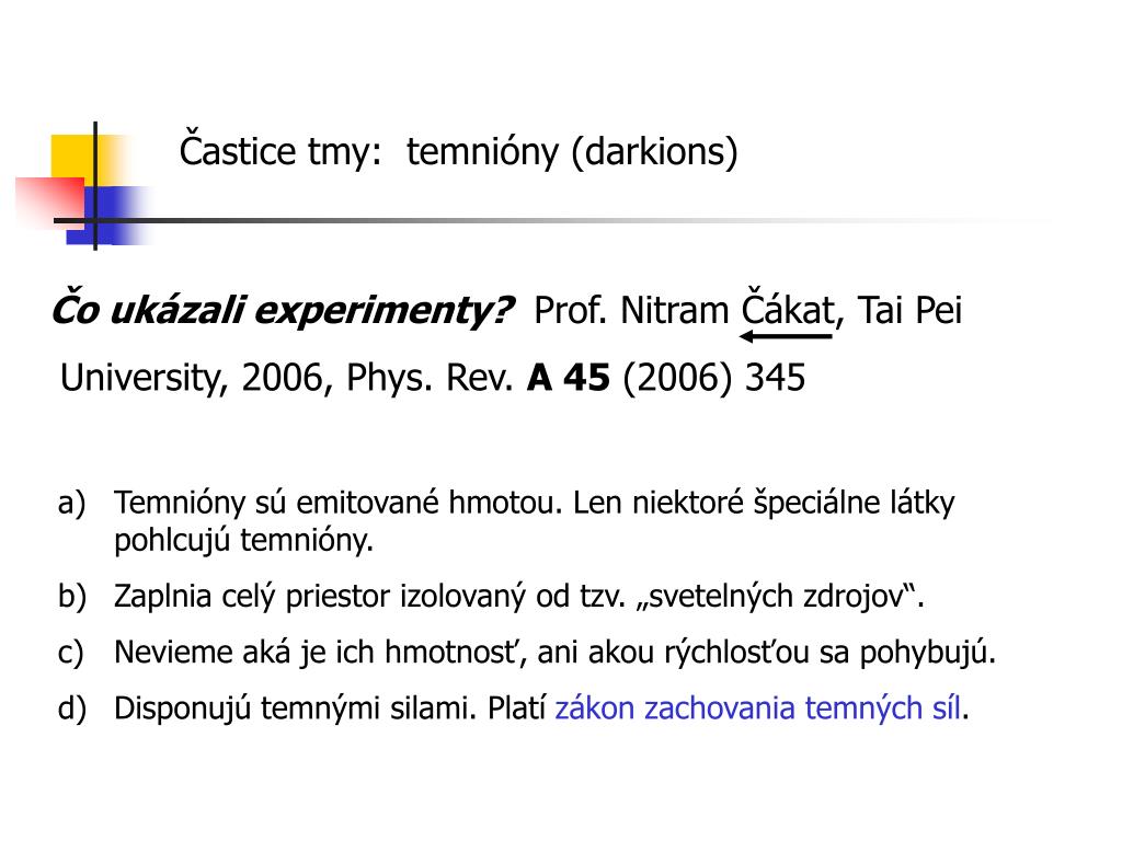 Čo ukázali experimenty?Prof. Nitram Čákat, Tai Pei University, 2006, Phys. Rev. A 45 (2006) 345 Častice tmy: temnióny (darkions) • Temnióny sú emitované hmotou. Len niektoré špeciálne látky pohlcujú temnióny. • Zaplnia celý priestor izolovaný od tzv. „svetelných zdrojov“. • Nevieme aká je ich hmotnosť, ani akou rýchlosťou sa pohybujú. • Disponujú temnými silami. Platí zákon zachovania temných síl.