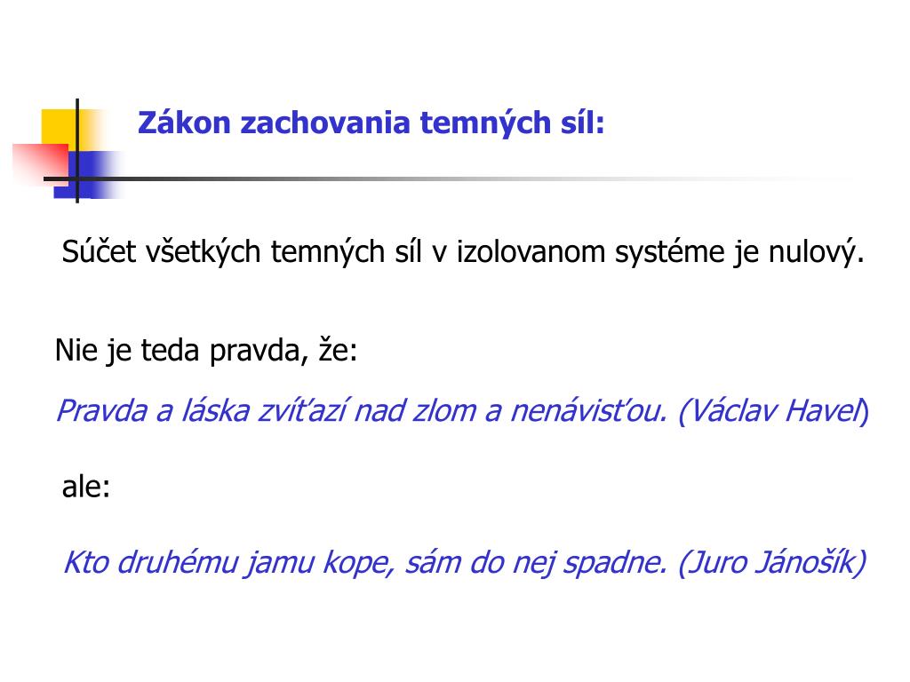 Zákon zachovania temných síl: Súčet všetkých temných síl v izolovanom systéme je nulový. Nie je teda pravda, že: Pravda a láska zvíťazí nad zlom a nenávisťou. (Václav Havel) ale: Kto druhému jamu kope, sám do nej spadne. (Juro Jánošík)