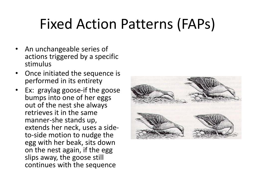 Fixed Action Patterns (FAPs) • An unchangeable series of actions triggered by a specific stimulus • Once initiated the sequence is performed in its entirety • Ex: graylag goose-if the goose bumps into one of her eggs out of the nest she always retrieves it in the same manner-she stands up, extends her neck, uses a side-to-side motion to nudge the egg with her beak, sits down on the nest again, if the egg slips away, the goose still continues with the sequence
